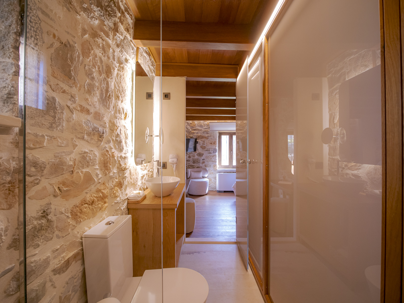Με είσοδο από το αίθριο η σουίτα αναπτύσσεται σε δύο επίπεδα. Η διακόσμηση είναι εκλεπτυσμένη, με παραδοσιακά στοιχεία που συνδυάζονται με μοντέρνες λεπτομέρειες. Η διατηρημένη παλαιά πέτρινη σκάλα κλέβει τη παράσταση.