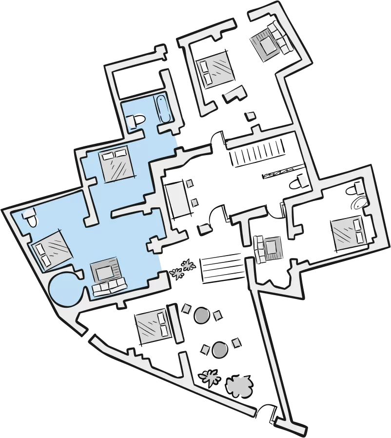 The old wine cellar has been transformed into an additional comfortable bedroom, dominated by a striking Venetian arch. It features a spacious double bed for restful sleep, a work desk, and a private bathroom with a whirlpool bathtub, offering a touch of indulgent relaxation.